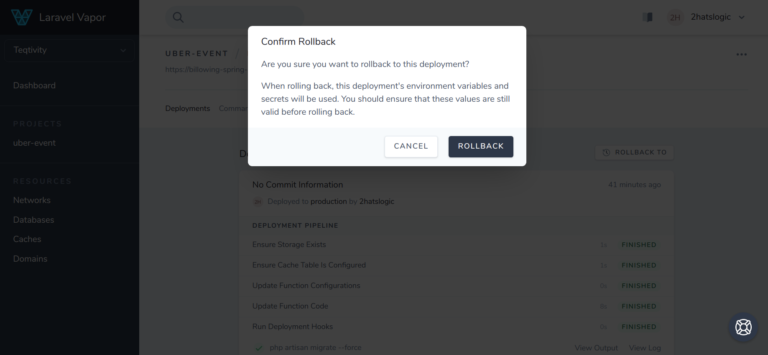 If you are having trouble with your current deployment you can immediately roll back to the previous deployment from the Vapor UI. Click on the previous deployment and click the ‘RollBack To’ button.