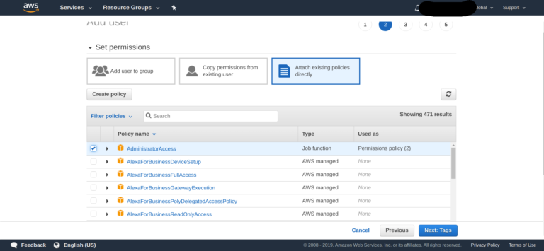 On the permissions management screen, you may grant full administrator access to the IAM user by selecting the “Attach existing policies directly” option and the “AdministratorAccess” policy. Once the policy has been attached, you may click “Next”.