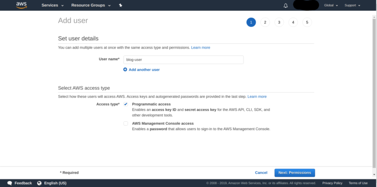 Next, click the “Add user” button and choose a username. When selecting an “Access type”, select “Programmatic access”. This instructs AWS IAM to issue an access key ID and secret access key for the IAM user. Then, click “Next”.