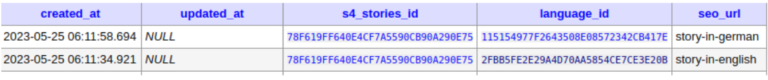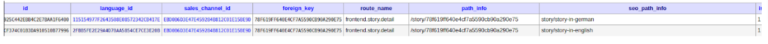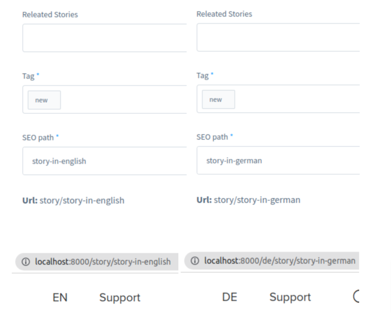 The following example shows the dynamic seo url for a single story in English and German language in both the backend and front.