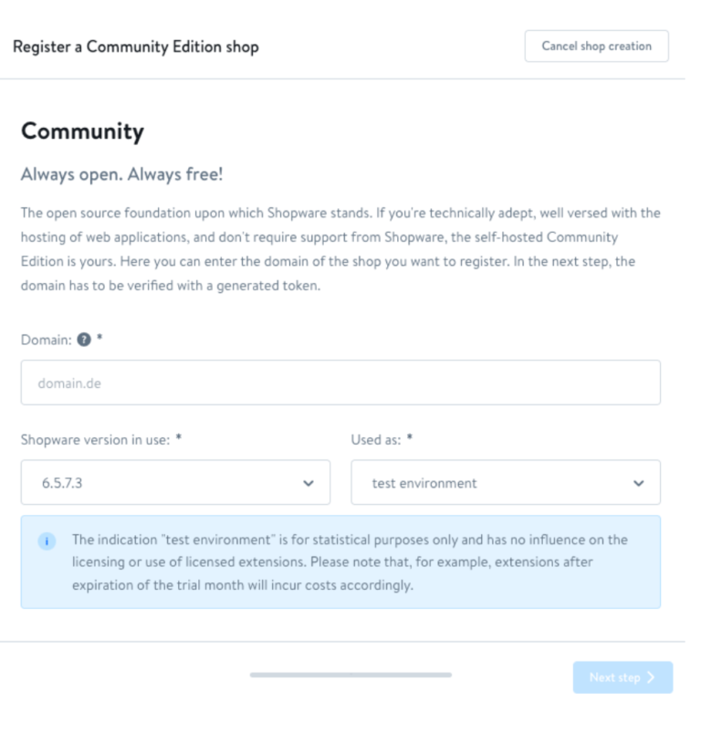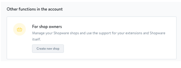 Register for a Shopware account. Fill in the basic details on the account registration page. Verify your email address and log in to the Shopware account. This is where you enter your basic information and payment details, and where you create your shop. Note that the Shopware administration is a completely different portal.