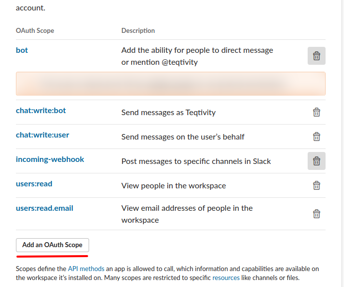 Basically, scopes are the permissions of the App. Scopes define the API methods an app is allowed to call, which information and capabilities are available on the workspace it’s installed on. To send a message, we need to add some scopes to the App.