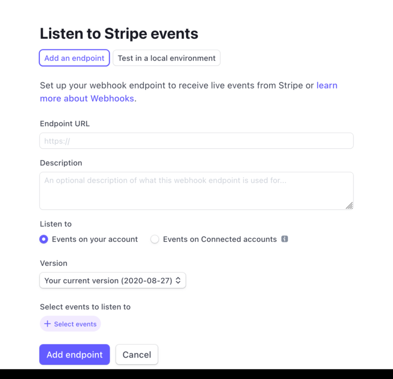 The first step is to register a webhook endpoint with Stripe. This is the URL that Stripe will send webhook notifications to. You can register a webhook endpoint in the Stripe Dashboard.